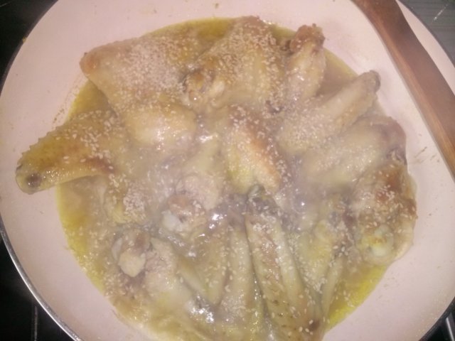 8 pilećih krila , 2 dl pileće supe , 2 kašike soja sosa , 2 kašike meda , 2 kašike soka od limuna , 2 kašike soka od pomorandze , 4 čena belog luka , so i biber . Ja sam dodala kari i susam.